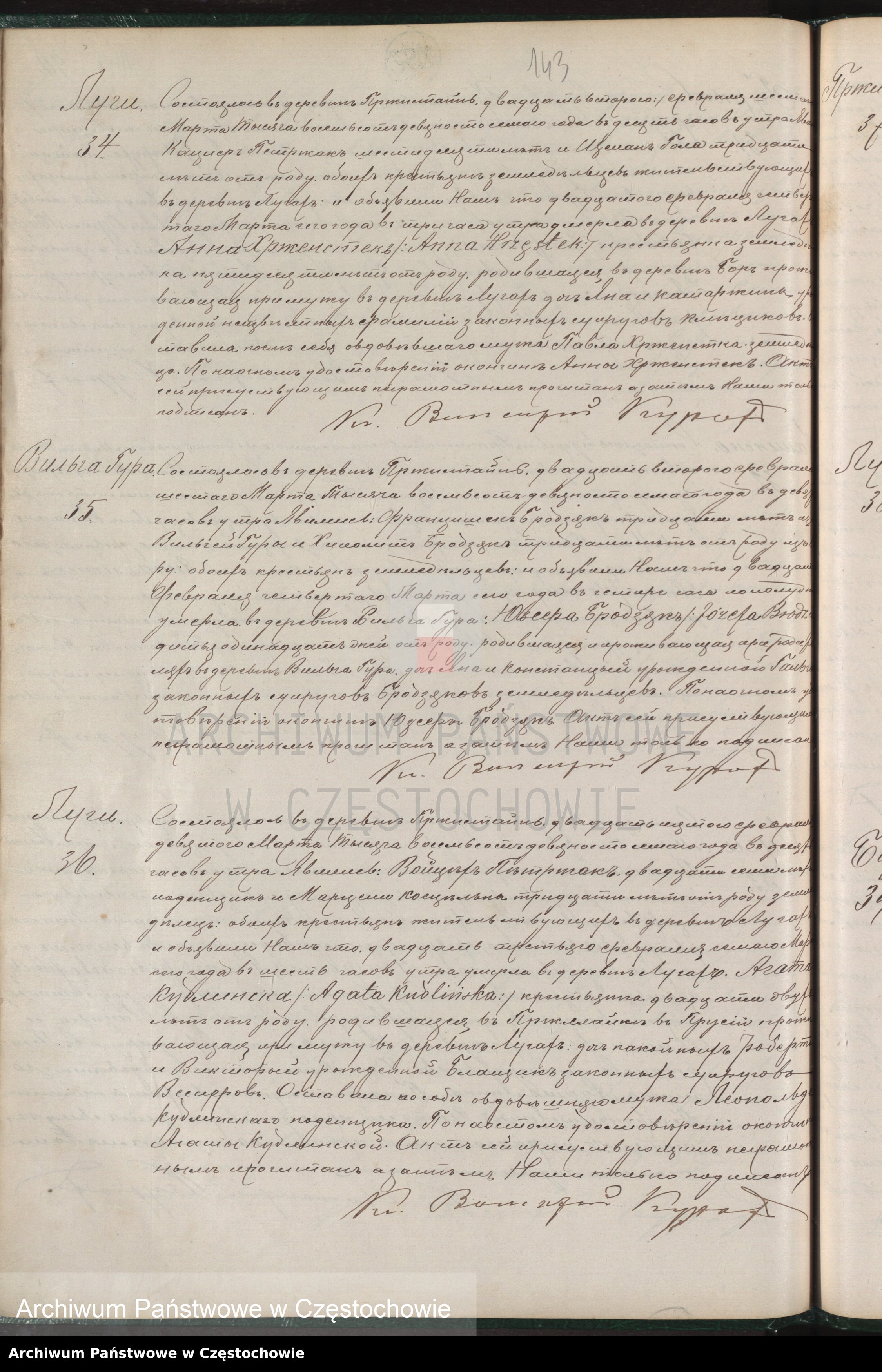 Wojciech Pietrzak 27 lat i Marcel Kościelny 30 lat oznajmili,że 7.03.br o 6 rano umarła we wsi Ługach Agata Kudlińska gospodyni ,23 lata.Urodzona w Prusach,zamieszkała przy mężu we wsi Ługach.Córka umarłych Roberta i Wiktorii urodzonej Błaszczak.Zostawiła owdowiałego męża Leopolda wyrobnika.