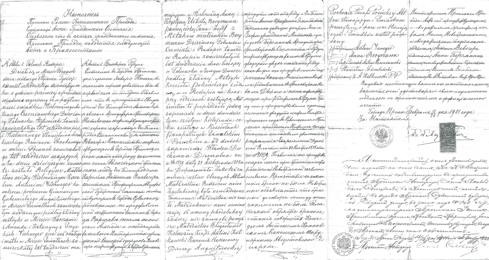 oraz akt ślubu Anny Krystyny Elżbiety Bergmann (córka Jana i Zofii z Mitaków dzierżawcy folwarku Rudupie)
