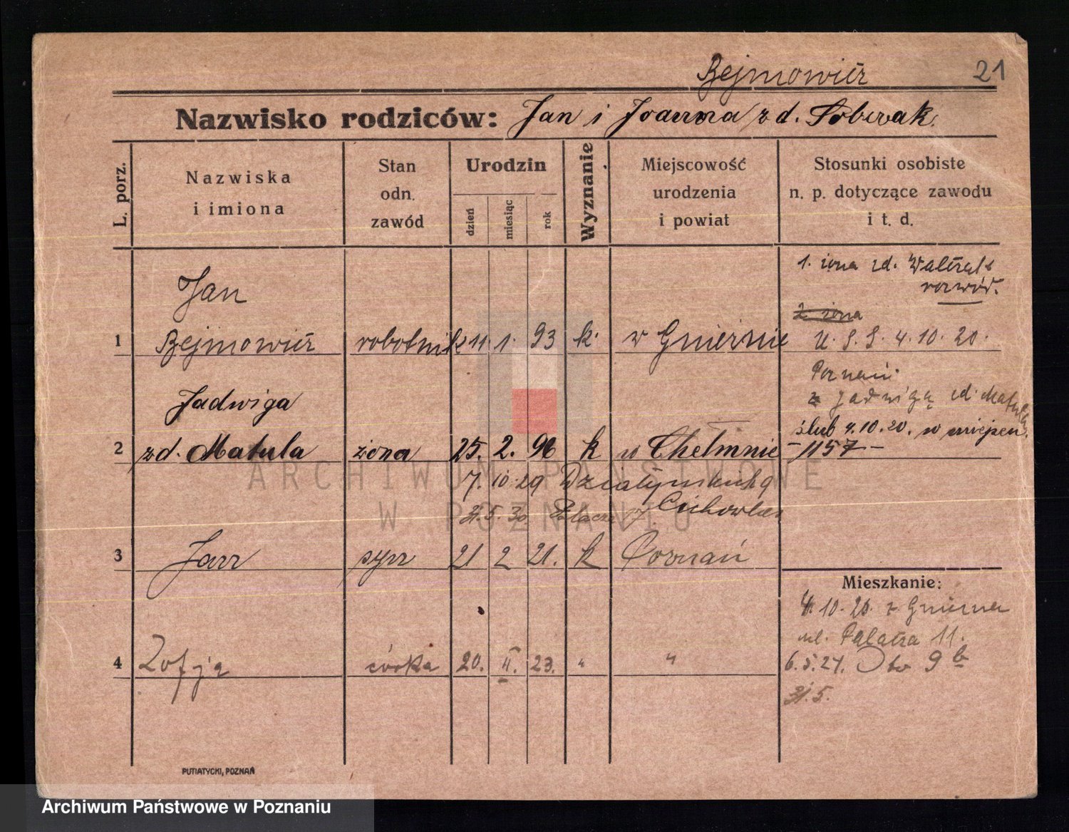 Jan Bejmowicz ur 1893r./Gniezno, syn Jana i Joanny Sobczak, mieszkał w Poznaniu. Jego I żoną była ??? z domu Walczak. z którą rozwiódł się. II żoną była Jadwiga Matula ślub 4.X.1920r./Poznań.