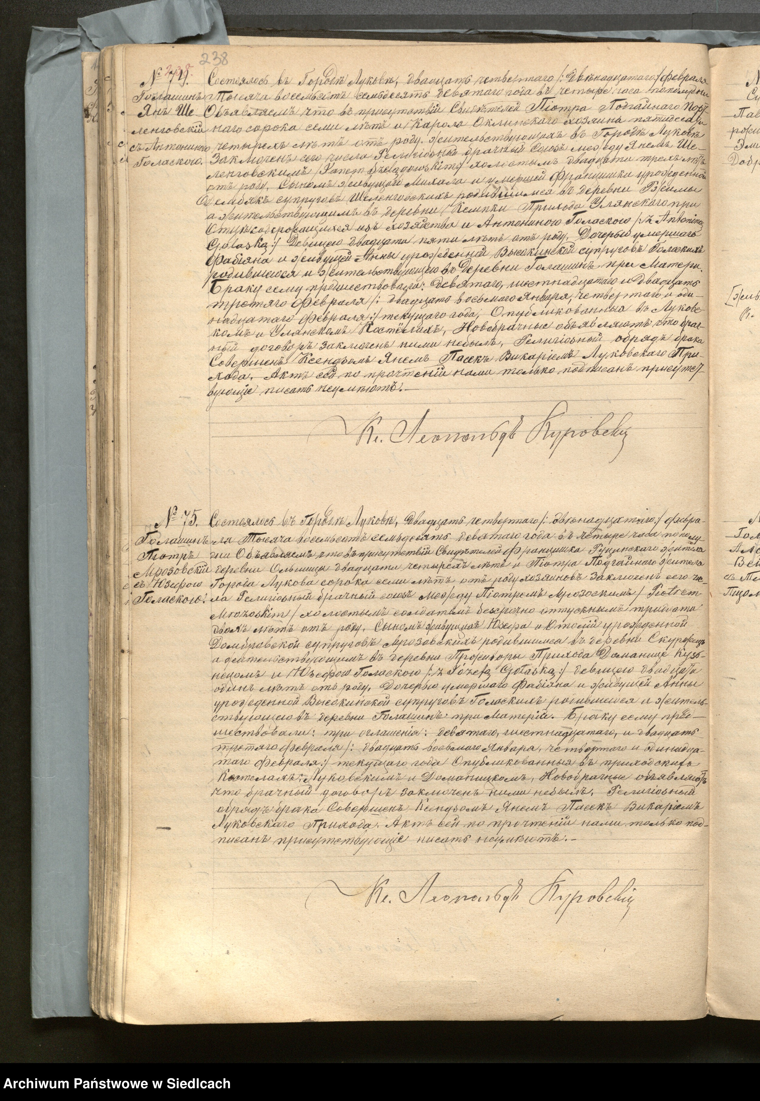 Syn Józefa - Piotr, również zawiera związek małżeński ze szlachcianką Józefą Goławską w Łukowie, 1879 r.