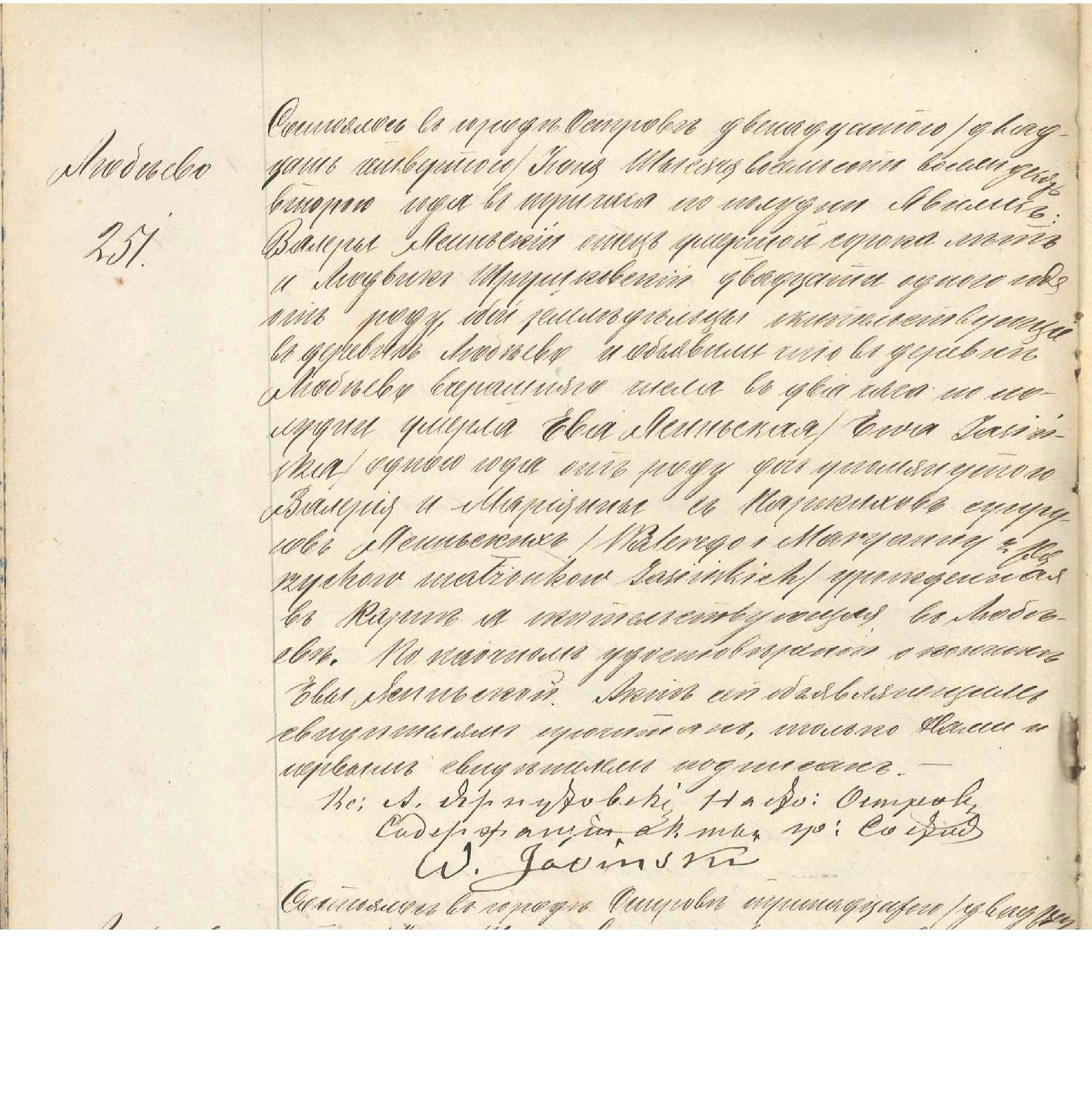 Działo się w mieście Ostrowie dwunastego/dwudziestego czwartego czerwca tysiąc osiemset osiemdziesiątego drugiego roku o godzinie trzeciej po południu. Stawili się: Walery Jasiński, ojciec zmarłej lat czterdzieści i Ludwik Truszkowski, lat dwadzieścia jeden, obaj rolnicy zamieszkali we wsi Lubiejewo i oświadczyli, że we wsi Lubiejewo w dniu wczorajszym o godzinie drugiej po południu zmarła Ewa Jasińska (Ewa Jasińska), jeden rok życia mająca, córka wspomnianego Walerego i Marianny z Parzychów małżonków Jasińskich (Walerego i Maryanny z Parzychów małżonków Jasińskich), urodzona w Karpiu a mieszkająca w Lubiejewie. Po naocznym stwierdzeniu śmierci Ewy Jasińskiej, akt ten zgłaszającym świadkom przeczytano, podpisałem z pierwszym świadkiem.