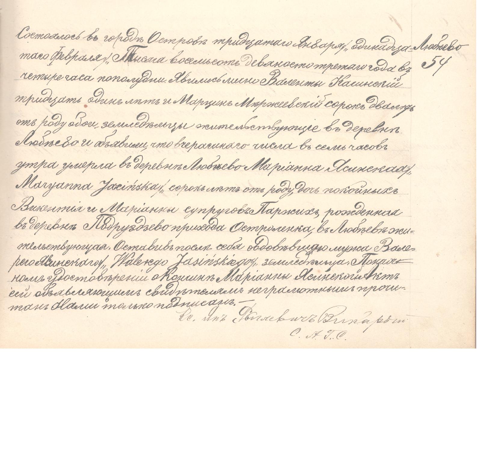 Działo się w mieście Ostrowie* trzydziestego stycznia/jedenastego lutego tysiąc osiemset dziewięćdziesiątego trzeciego roku o godzinie czwartej po południu. Stawili się osobiście Walenty Kasinski, lat trzydzieści jeden i Marcin Mierzejewski, lat czterdzieści dwa, obaj rolnicy zamieszkali we wsi Lubiejewo i oświadczyli, że w dniu wczorajszym o godzinie siódmej rano zmarła we wsi Lubiejewo Marianna Jasinska (Maryanna Jasińska), czterdziestoletnia; córka nieżyjących Wincentego i Marianny małżonków Parzych, urodzona we wsi Podruzdzewo** w parafii Ostrołęka, w Lubiejewie mieszkająca. Zostawiła po sobie owdowiałego męża Walerego Jasińskiego, rolnika. Po naocznym stwierdzeniu śmierci Marianny Jasinskiej, akt ten zgłaszający świadkom, niepiśmiennym przeczytano, sam podpisałem.