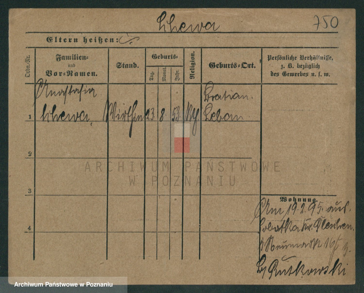 Poproszę o pomoc w odcyfrowaniu fragmentów wpisu z ewidencji ludności Poznania Anastazji Schewy: