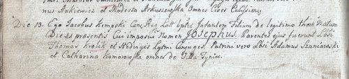 Leon dziecko syn prawowity dnia 11 bm. o godz 5 urodzony ochrzczony został przez kanonika Franciszka Karkoszyńskiego. Rodzice : pracowici Tomasz Kroliki Jadwiga Szymanska małżonkowie prawni mieszkańcy tynieccy. Chrzestni : Ignac Rutowicz i Julianna Gozdziowa z Tyńca