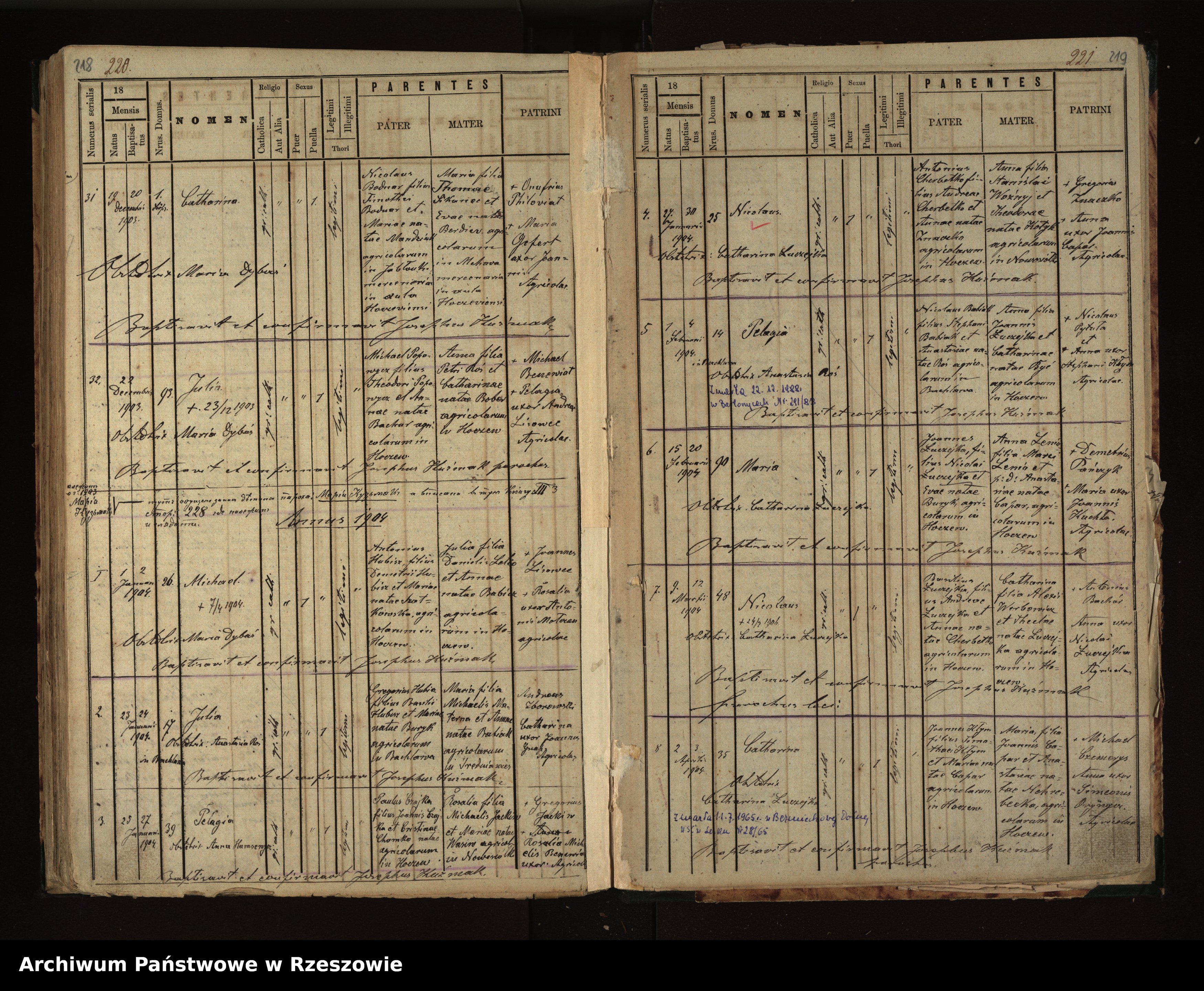7 / 9 III / 12 III / 48 / Mikołaj (+ 24/2 1906) / [religia:] grekokatolicka / Bazyli Łuczejko, syn Andrzeja Łuczejki i Anny z domu Cherbetko, rolników w Hoczwi / Katarzyna, córka Aleksego Werbowicza i Tekli z domu Łuczejko, rolników w Hoczwi / [chrzestni:] + Antoni Bachór; Anna, żona Mikołaja Łuczejki; rolnicy