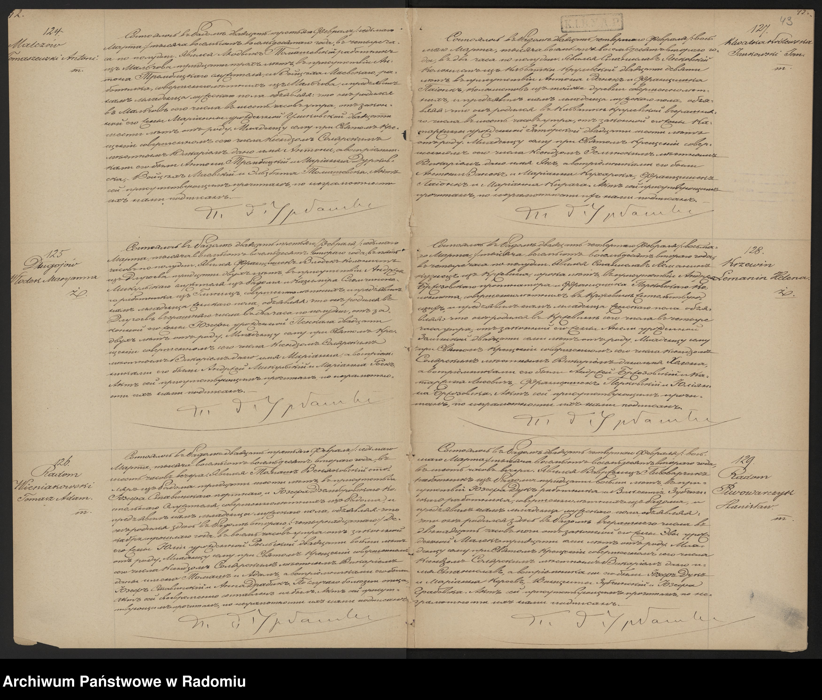Wydarzyło się w Radomiu 23 lutego / 7 marca 1882r o piątej po południu. Stawił się Stanisław Włodek kolonista z Długojewa lat 32 i w obecności Andrzeja Mikulskiego służącego z Radomia i Kazimierza Słomczyńskiego robotnika z Glinic? pełnoletnich i okazał mi dziecko płci żeńskiej oświadczając, że urodziło się ono w Długojewie w dniu wczorajszym o drugiej po południu z jego żony Józefy z domu Pękała lat 22. Dziecku temu na chrzcie świętym w dniu dzisiejszym przez księdza Solarskiego miejscowego wikarego dano imię Marianna a chrzestnymi byli Andrzej Mikulski i Marianna Rojek. Akt ten obecnym niepiśmiennym został przeczytany i ja podpisałem. podpis.