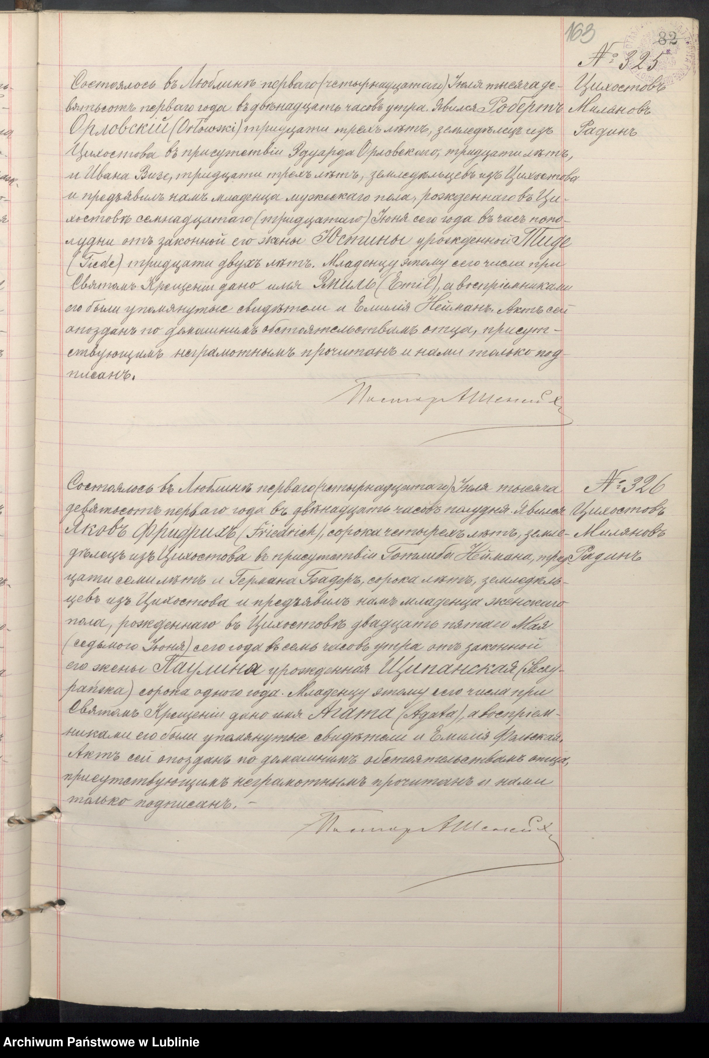 1895 AZ Cichostów Karol F. syn Jakuba i Pauliny Szczepańskiej, lat 14, urodzony Łazy, zgłasza Krystian Domański Gustaw Bulc,