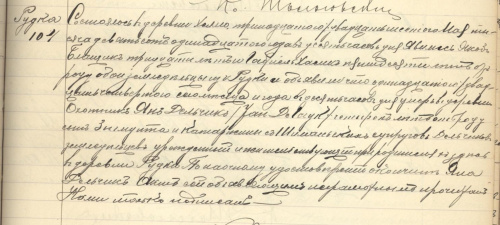 Stawił się Walenty Delczyk rolnik z Rudki 28 l. w obecności Gabriela Hasik i Franciszka Furmańczyk 50 l. obydwaj rolnicy z Rudki i okazał Nam dziecię płci żeńskiej oświadczając że urodziło się ono we wsi Rudka 15/28.06 tego roku o 2-giej po południu od jego prawowitej żony Józefy z Nowaków 27 l. Dziecięciu temu na chrzcie świętym dopełnionym w dniu dzisiejszym dano imię Marianna a chrzestnymi jego byli Ignacy Chuguszczyk i Jadwiga Wojtaszczyk. Akt ten stawającemu i świadkom niepiśmiennym przeczytano Nami tylko podpisano. (podpis nieczytelny)