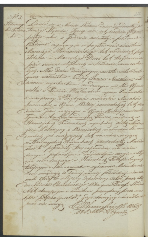 Działo się w Mieście Służewie dnia 23 stycznia 1865 o godzinie 12 w południe. Wiadomo czynimy iż w przytomności światków Marcelego Hermanowskiego lat 65 stolarza i Marcelego Dorsz?? lat 35 szewca obydwóch w Służewie zamieszkałych . Na Dniu Dzisiejszym zawarto zostało religijne małżeństwo miedzy Janem Nowakiem młodzianem wyrobnikiem urodzonym we Wsi Ujma Wielka w Powiecie Włocławskim synem Franciszka i Marianny z Przybyszów małżonków Nowaków komorników w Ujmie Wielkiej zamieszkałych lat 21 mającym w Ujmie Wielkiej zamieszkałym a Anna Lewandowską Panna urodzoną w Starowiejskich Rudunkach wyrobnicą córką Andrzeja i Katarzyny z Wiśniewskich małżonków Lewandowskich już nieżyjących lat 18 mająca w Starowiejskich Rudunkach zamieszkałą .Małżeństwo to poprzedziło trzy zapowiedzi na dniu 8, 15 i 22 stycznia r. b. ..