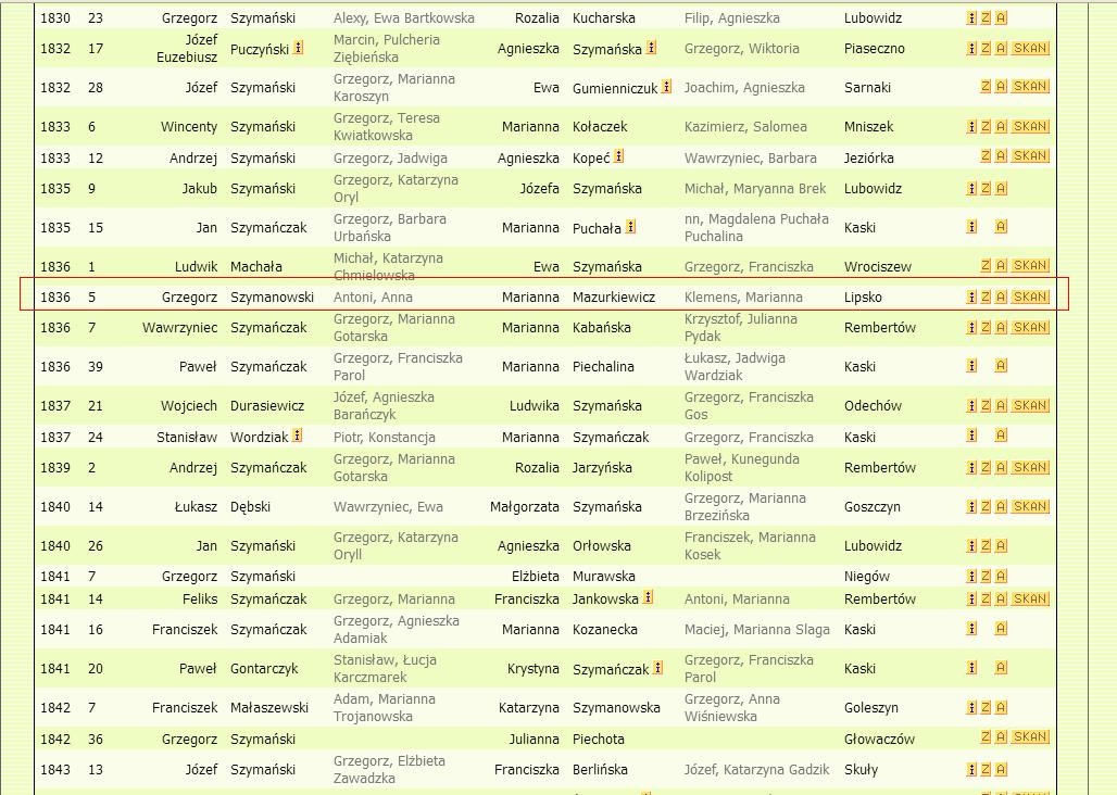 Szukaliśmy więc dalej i mamy akt ślubu Grzegorza Szymanowskiego z Marianną Mazurkiewicz 1836r Miejscowość to CHYBA Lipsko: