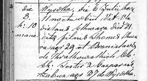 Dnia 6 lipca o godzinie 11 w nocy zmarł Wit Władysław Skwara w 21 dniu życia swego, syn Tomasza Skwary, rolnika 29 lat i Bronisławy z Kralkowskich, prawnie poślubionych. Drugi świadek: Kacper Łabun rolnik 37 lat z Wysokiej.