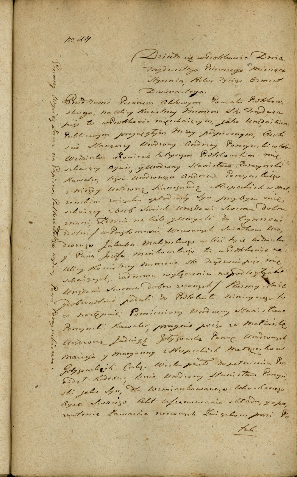 „Maiąc uswiadomienie przez moiego Syna w dniu 19tym lutego R.B., że WW Pan Dobrodzi, żądasz osobistości moiey do dania Błogosławieństwa Synowi memu Zabierajacego się do Stanu Małżeńskiego, któremu ja już dawniej ofiarowałam Błogosławieństwo i zezwolenie z życzeniem Jego najpomyślniejszym, A że teraz dla słabości Zdrowia mego stanąć nie mogę osobiście, upraszam Łaski WW Pana Dobrodzija, aby nie tylko Excuza moia była przyjeta lecz błogosławieństwo i zezwolenie jako od Matki szczerze życzonej synowi memu, A do tego Stawiam jeszcze W X [..] Kaznodzieja Farnego, znajac tego Prałata uczciwość i Szacunek spodziewam się że prośbie moiej zadość uczyni i stanie Synowi memu w osobie moiey do dania Jemu błogosławaieństwa, zezwolenia i wszelkiej pomocy ode mnie należącey prawem przypisany. Zostając z wysokim szacunkiem i upoważnieniem Wielmoznego WW Pana Dobrodzieja prawdziwa i unizona [..] do Wielmożnego Pisarza Aktowego”