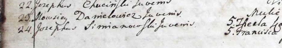 Ale kto jest chrzczony? Na początku napisano: Hugo (?) Franciscus Josephus [tutaj nadpisano: patris (?)] Zieliński, pocillatoris różanen. […] — Hugo (?) Franciszek Józef [ojca?] Zielińskiego, podczaszego różańskiego […].