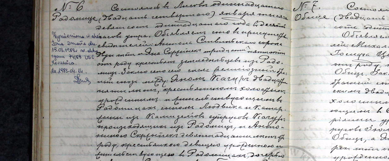 Akt małżeństwa Tekli i Stanisława skrzypków z Radomic 1889 Lisów