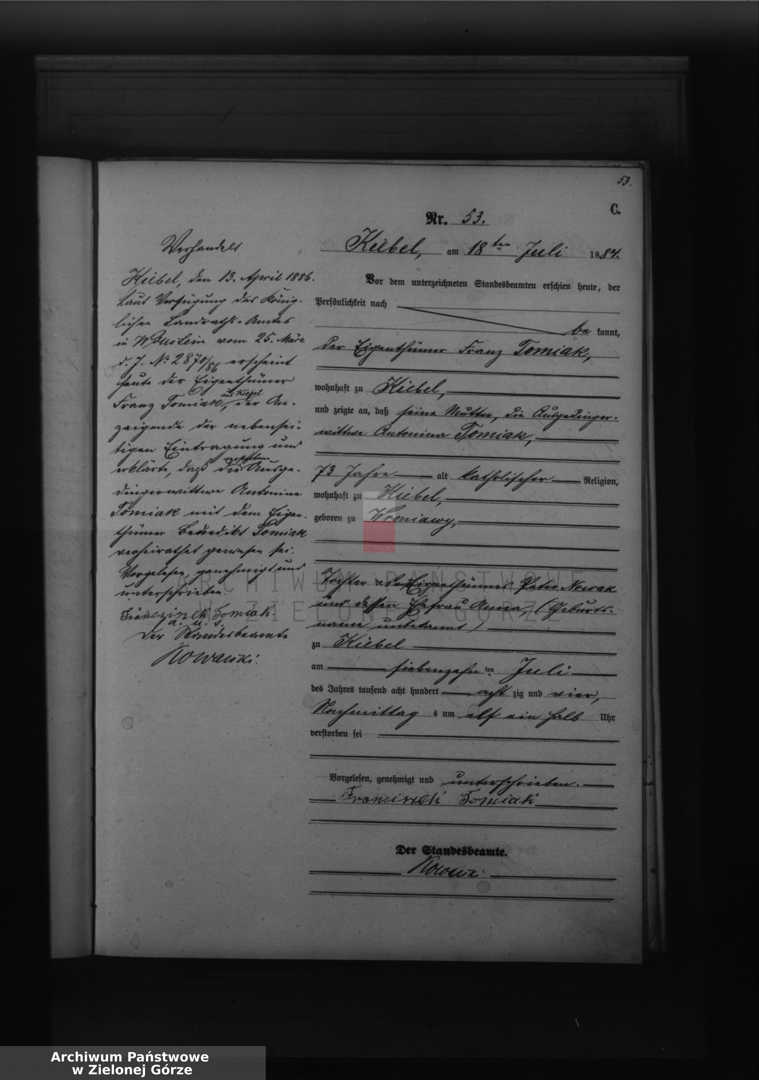 w Wonstein z 25.03.1886 nr 2870/1886, stawił się dzisiaj Franz Tomiak z Kiebel zgłaszający