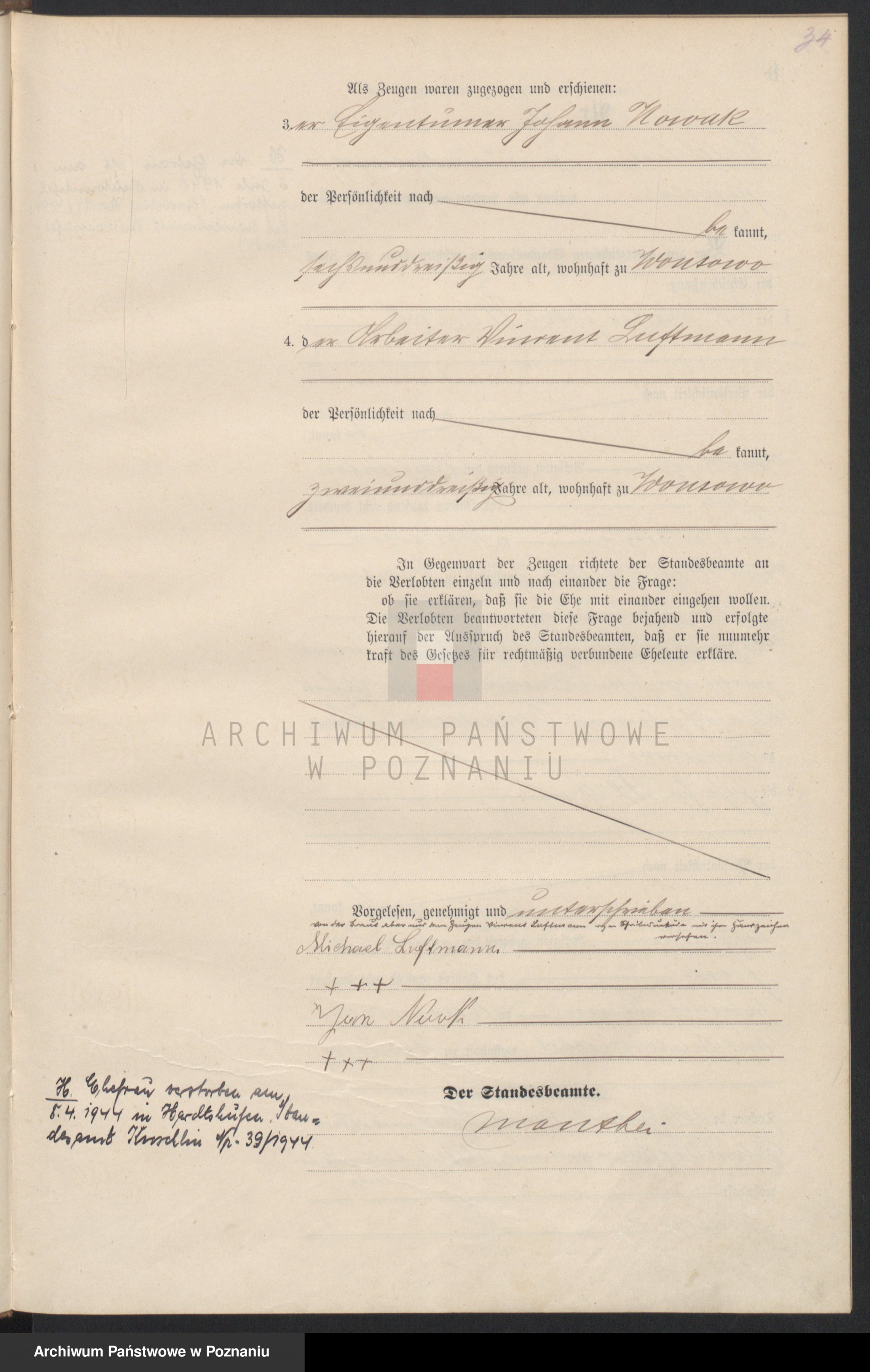 przez narzeczoną oraz świadka Vincent Luftmann z powodu niepiśmienności /wegen Schreibensunkunde/