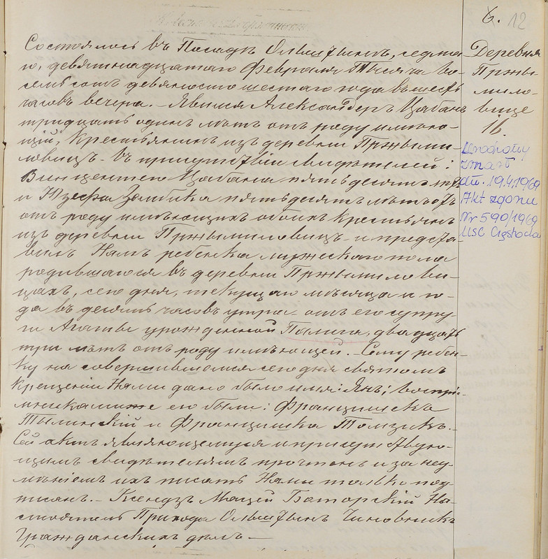 Działo się w osadzie Olsztyn 7/19 lutego 1896 o godzinie 6 wieczorem, stawił się Aleksander Caban lat 31, włościanin ze wsi Przymiłowice i w obecności świadków Wincentego Cabana lat 50 i Józefa Ziembika lat 50 obydwu włościan ze wsi Przymiłowice, i okazał nam dziecko płci męskiej urodzone we wsi Przymiłowice dzisiejszego dnia tego miesiąca i roku o godzinie 10 rano od jego małżonki Agaty Paligi? lat 23. Dziecku temu na chrzcie świętym celebrowanym przez Nas dzisiejszego dnia dano imię JAN a rodzicami chrzestnymi byli Franciszek Tyliński i Franciszka Tomzik. Akt ten obecnym niepiśmiennym przeczytany i przez Nas tylko podpisany. Ks. (…)