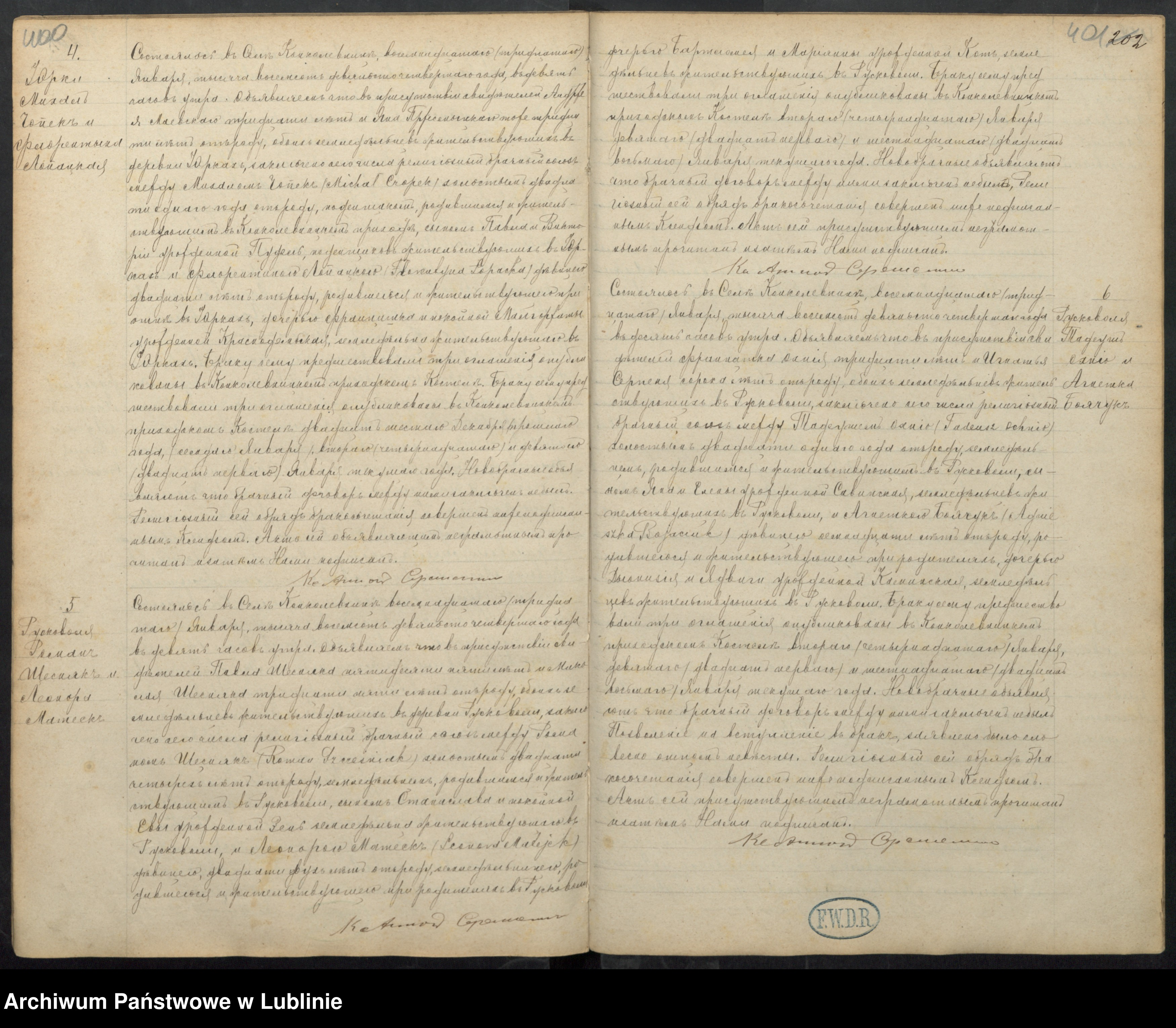 Młody: Michał Czopek, kawaler, lat 21, wyrobnik, ur. i zam. w par. kąkolewnickiej, syn Pawła i Wiktorii zd. Pudel wyrobników zam. w Jurkach,
