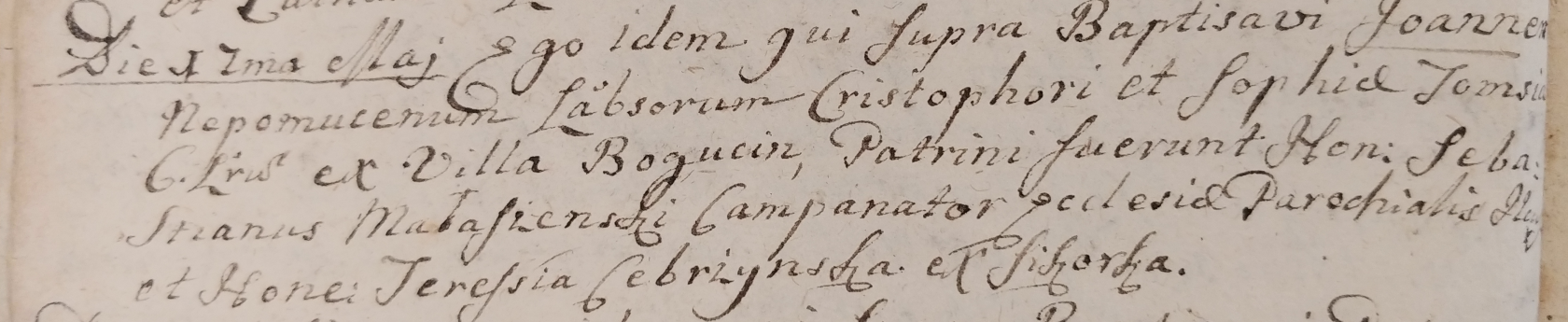 chrzestni: uczciwy Sebastian Małaszeński, dzwonnik olkuskiego kościoła parafialnego; uczciwa Teresa Cebrzyńska z Sikorki