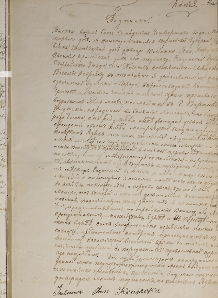 1874 года мая 1 дня я, нижеподписавшаяся Варшавской губернии, [города] Блона, крестьянская дочь девица Юлианна [córka] Яна, а по-русски Иванова, Кралевская, дала сию подписку Рязанской губернии Егорьевского уезда села Починок настоятелю священнику Василию Некрасову в том, что я действительно с той [?] означенной губернии и города, вероисповедания католического, грамоте по польски читать и писать знаю, проживала [...] возрастом лет моих постоянно в г. Варшаве [в] услужении, но родилась в селении Холевах, что близ города Блона, от роду имею лет двадцать девять, [..] о рождении своём имею метрическое свидетельство на польском языке, - то самое которое предоставляла для [Вас?] в марте месяце сего года при изъявлении моего согласия по прошению Вашему на присоединение мне к православной восточной церкви и с которого по совету Вашему имею перевод с польского и на русском [...] высланное мне из г. Варшавы в последних числах [..] месяца.