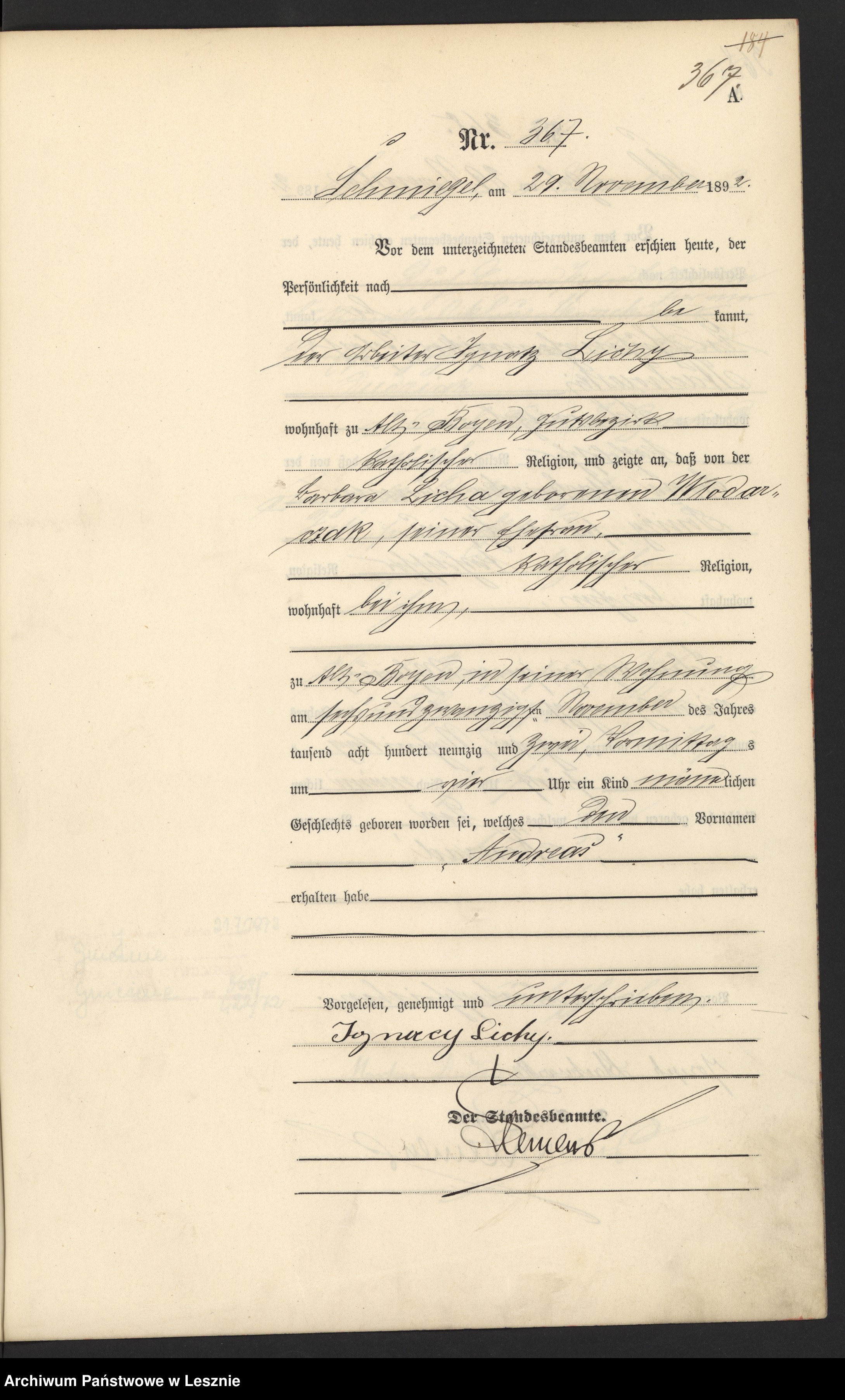 Akt urodzenia, Lichy - Śmigiel 1892 OK