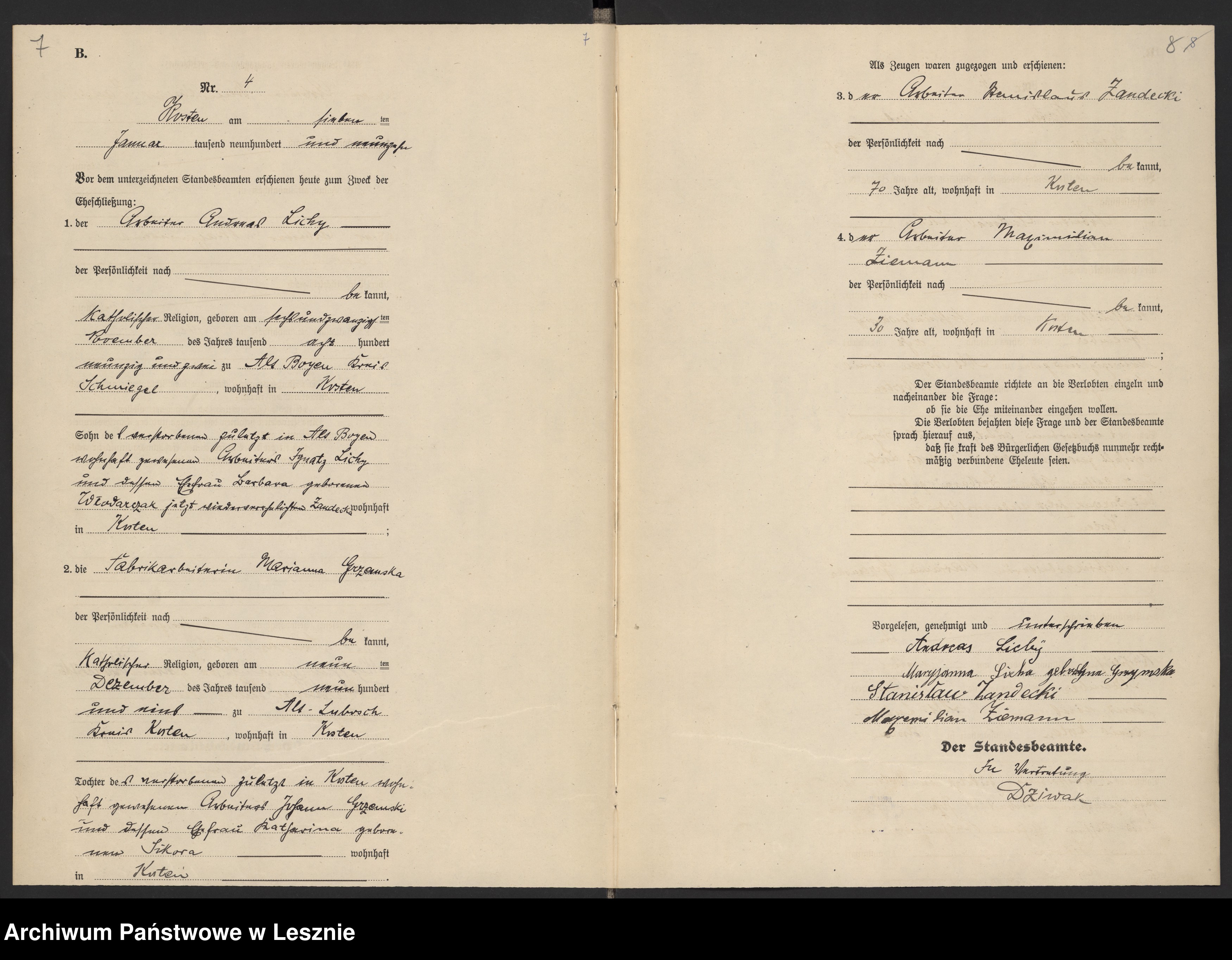 M 4; Kościan, par. Kościan; 1919; Lichy Andrzej i Marianna Grzemska (ślub)