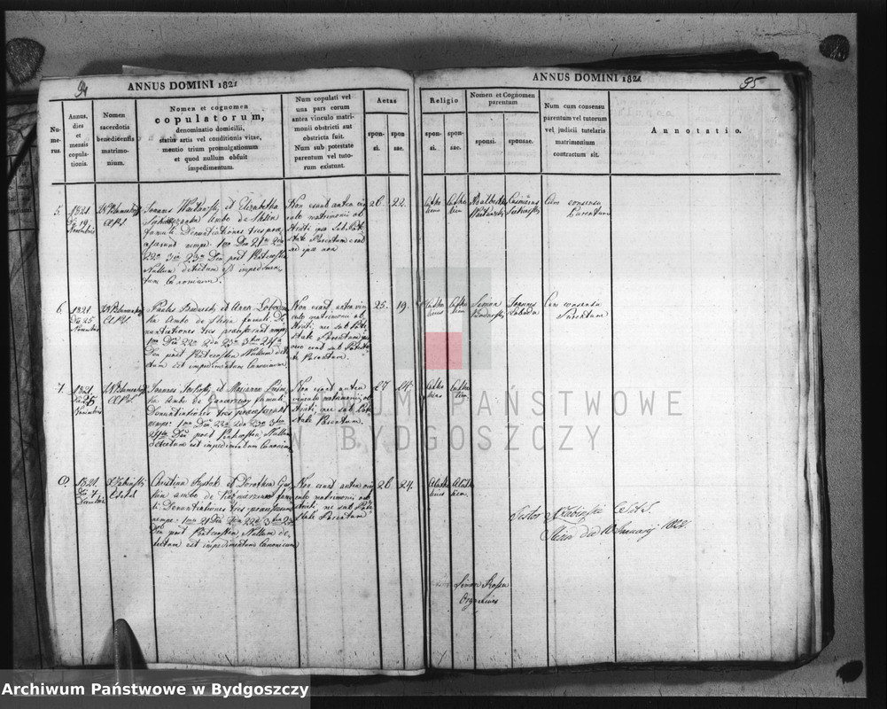 6 / 25 XI 1821 / J.N. Blumenhoff, c.c.p.s.* / Paweł Badurski i Anna Łobodzianka, oboje ze Ślesina, służący; miały miejsce 3 zapowiedzi, a mianowicie I w 22 niedzielę, II w 23, a III w 24 niedzielę po Zielonych Świątkach; nie wykryto żadnej przeszkody kanonicznej / nie byli przedtem złączeni węzłem małżeńskim ani pod władzą rodziców, ona zaś była pod władzą rodziców / 25; 19 / katolik; katoliczka / [rodzice narzeczonego:] Szymon Badurski / [rodzice narzeczonej:] Jan Łoboda / za zgodą rodziców