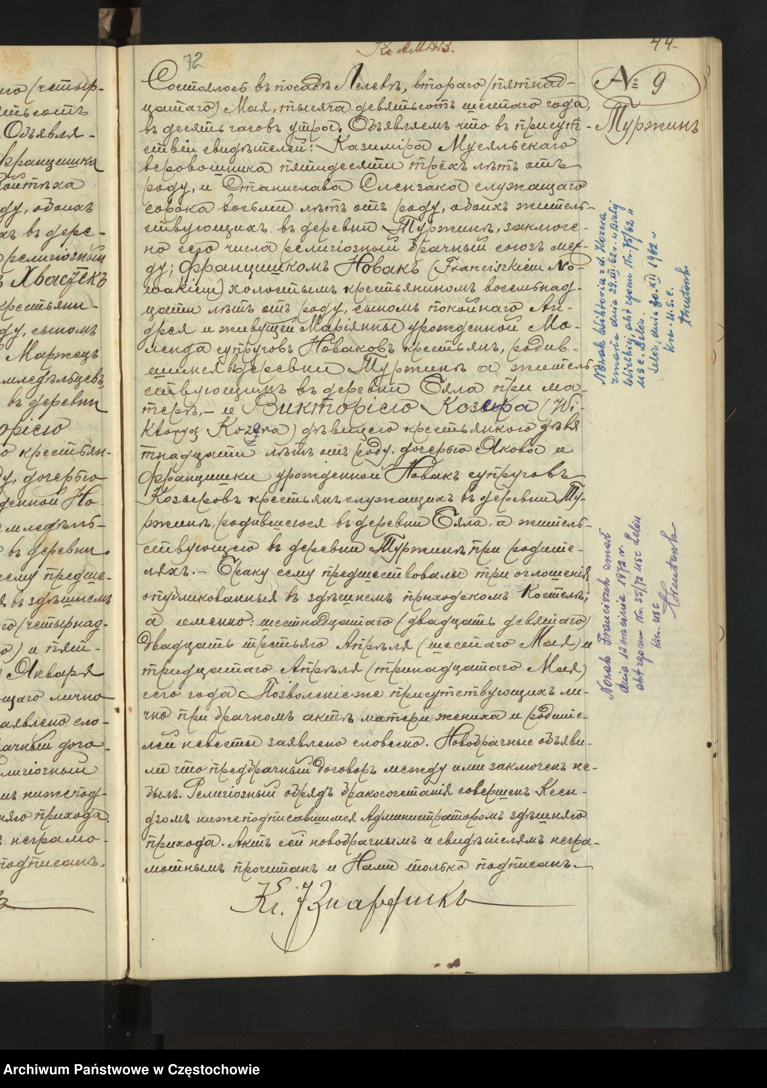 Stawił się Jan Mucha lat 48 i Wincenty Moryń lat 32, obydwaj gospodarze ze wsi Biała i oświadczyli że we wsi Biała 31 marca bieżącego roku o godzinie 10 wieczorem zmarł robotnik dniówkowy Roch Kasznia, żonaty lat 62, urodzony w Ślęzanach parafii Staromieście i zamieszkały we wsi Biała. Syn zmarłych Józefa i Marianny z.d. Napora, małżonków Kaszniów chłopów. Zostawił po sobie owdowiałą żonę Agnieszkę z.d. Grabowską. Po naocznym przekonaniu się o śmierci Kaszki akt ten stawiającym przeczytany został i przez nas tylko podpisany.