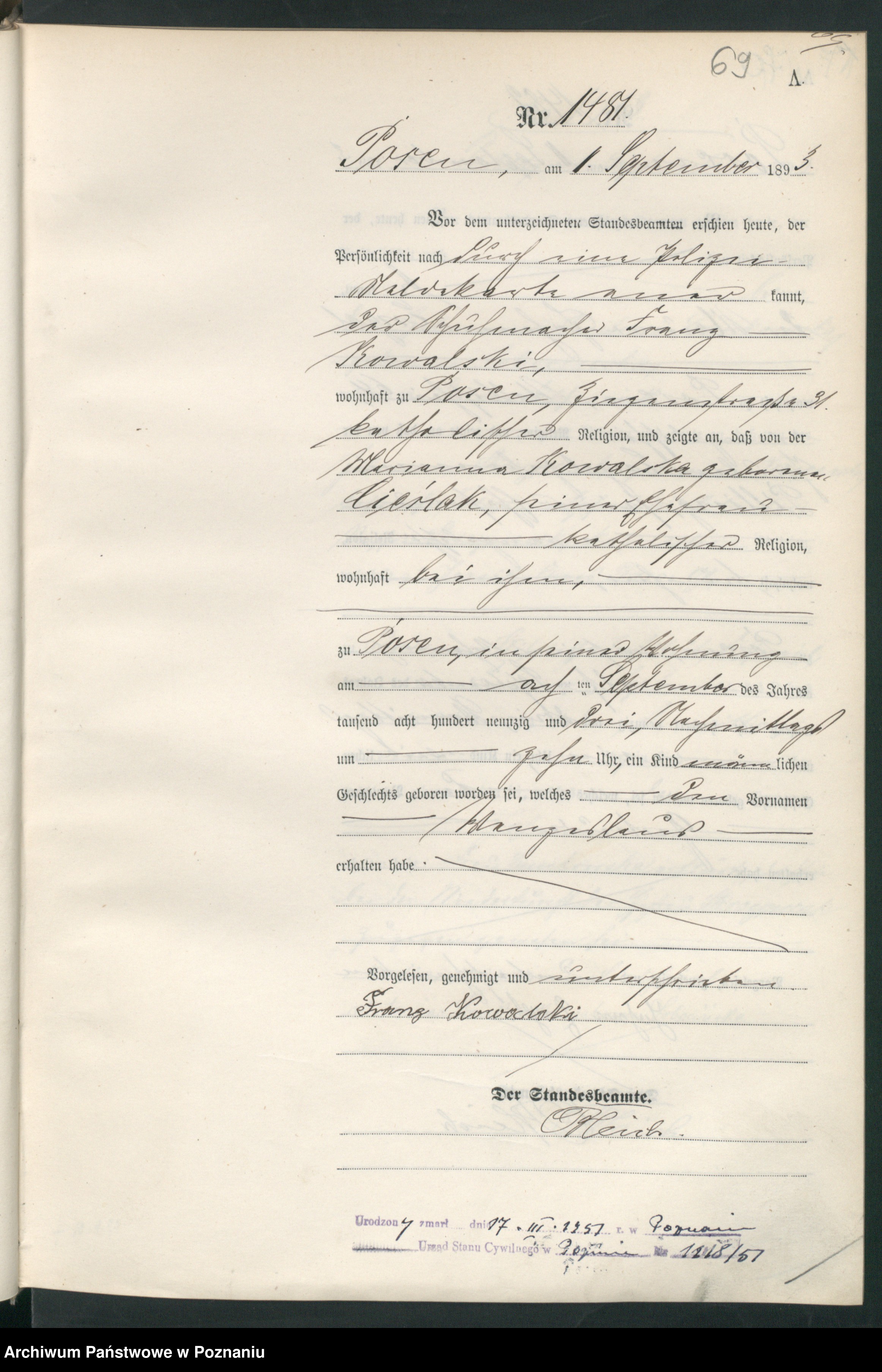 zam. Poznan Ziegenstraße 31, katolik i zglosil, ze jego malzonka Marianna Kowalska dd Cieslak, katoliczka zam. przy mezu, w Poznaniu w jego mieszkaniu dnia 9.9 1893 po poludniu o 10 urodzila dziecko pl.m. ktoremu nadano imie Wenzeslaus