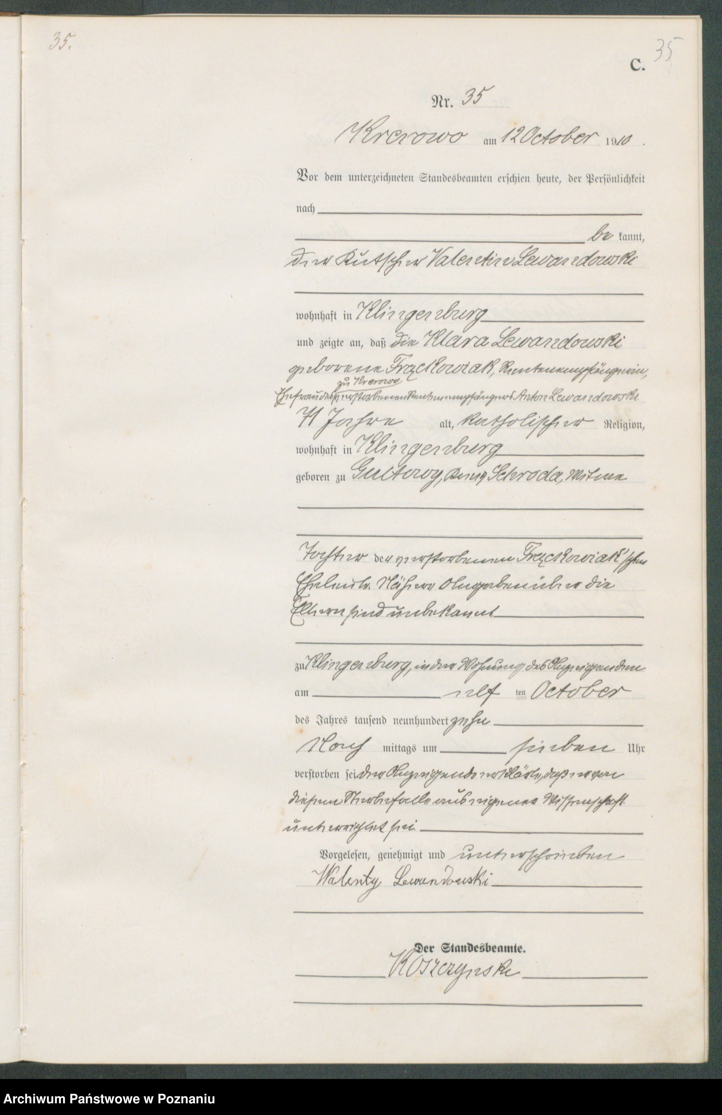 i zgłosił, że ... Klara Lewandowska z domu Frąckowiak, ... ... ... z Krerowa, wdowa po Antonim Lewandowskim, mająca 71 lat, wyznania katolickiego, zamieszkały w Klingenburg (?), urodzona w Gułtowach w powiecie średzkim ...