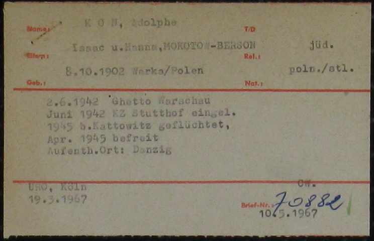 Szukam informacji o polskiej osobie. Osoba nazywa się Adolf Kohn lub Kon, urodzona w Warce koło Warszawy 8-10-1902. Prowadzę badania dotyczące działań wojennych i nie mogę nigdzie w Polsce znaleźć informacji o tym mężczyźnie. Kto może mi pomóc?