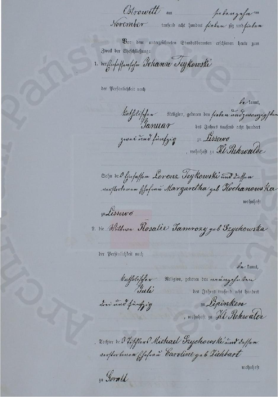... dnia 17.11.1877Masia pisze:Proszę o przetłumaczenie z języka niemieckiego aktu ślubu głównie chodzi mi o status/zawód poszczególnych osób oraz w mniejszym stopniu o daty w celu potwierdzenia moich przypuszczeń. Z góry wielkie dzięki.