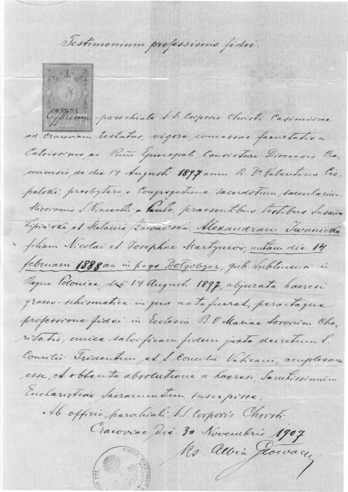 Urząd parafii Bożego Ciała w Krakowie na Kazimierzu zaświadcza, że na mocy upoważnienia udzielonego dnia 14 VIII 1897 r. przez prześwietny i najprzewielebniejszy konsystorz biskupi diecezji krakowskiej wielebnemu ks. Walentemu Ciopalskiemu ze Zgromadzenia Księży Misjonarzy św. Wincentego a Paulo, w obecności świadków: Zuzanny Lipińskiej i Melanii Zawadzkiej - Aleksandra Iwanicka, córka Mikołaja i Józefy z domu Martyniów, urodzona dnia 14 II 1888 r. we wsi Dołgobycz w guberni lubelskiej Królestwa Polskiego - dnia 14 VIII 1897 r., wyrzekłszy się herezji grecko-schizmatyckiej, w której się urodziła, i dokonawszy wyznania wiary w kościele Najśw. Maryi Panny Sióstr Miłosierdzia, przystąpiła do jedynej zbawiennej wiary, zgodnie z dekretem Św. Soboru Trydenckiego i Św. Soboru Watykańskiego, a otrzymawszy rozgrzeszenie z herezji, przyjęła Najśw. Sakrament Eucharystii.
