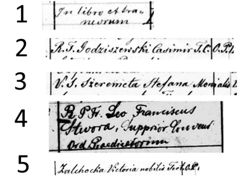Np. w "Reverendus frater Godziszewski Casimirus T. conventus ordinis praedicatorum" (wielebny brat Godziszewski Kazimierz T klasztoru zakonu dominikanów) T to może być nazwa miejscowości, w której jest klasztor