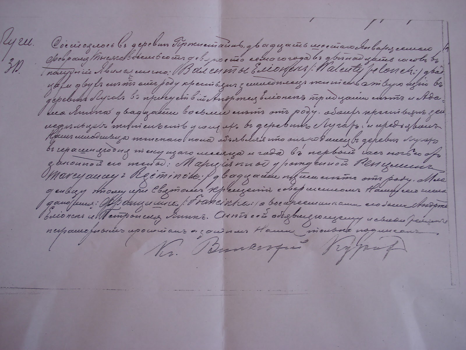 Działo się we wsi Żytniów 1 / 13 maja 1886 roku o godzinie 2 po południu. Stawił się osobiście Jakub Rozik 28 letni komornik mieszkający w Jelonkach, w obecności Franciszka Latuska 61 lat i Ignacego Antosika 37 lat, obu rolników mieszkających w Jelonkach i okazał Nam dziecię płci żeńskiej, oświadczając że ono urodziło się w Jelonkach tego dnia, miesiąca i roku o godz. 1 rano, od prawowitej jego żony Weroniki z Adamczyków 21 letniej. Dziecięciu temu na chrzcie świętym udzielonym przeze Mnie dano imię Julianna, a chrzestnymi byli: Baltazar Przedelec? i Józefa Antosik. Akt ten okazującemu i świadkom niepiśmiennym przeczytano i dlatego Ja tylko podpisałem.