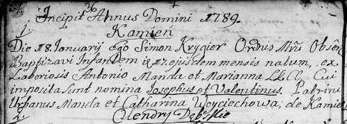 chrzestni: Urban Manda; Katarzyna Wojciechowa; z Kamienia