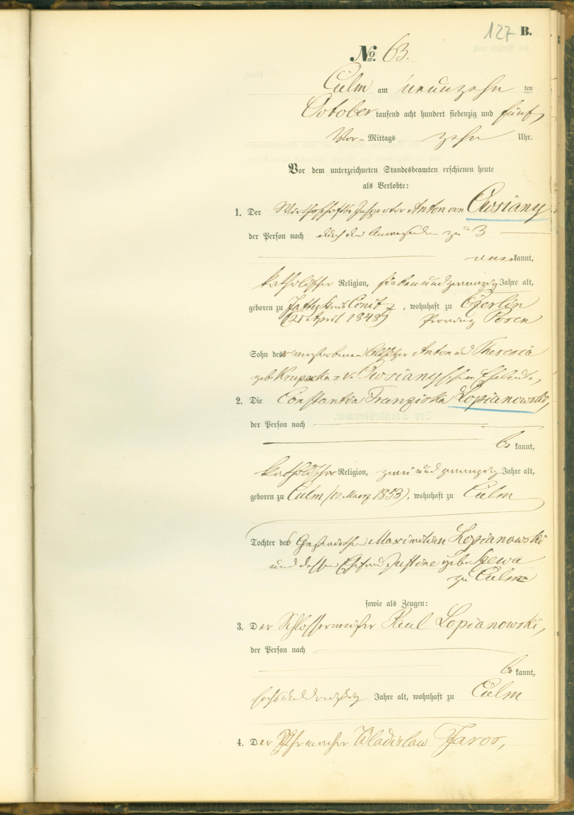 Rodzice panny młodej: Maxymilian Łopianowski i Justyna Szewa, panna młoda urodzona 12 marca 1853 w Chełmnie