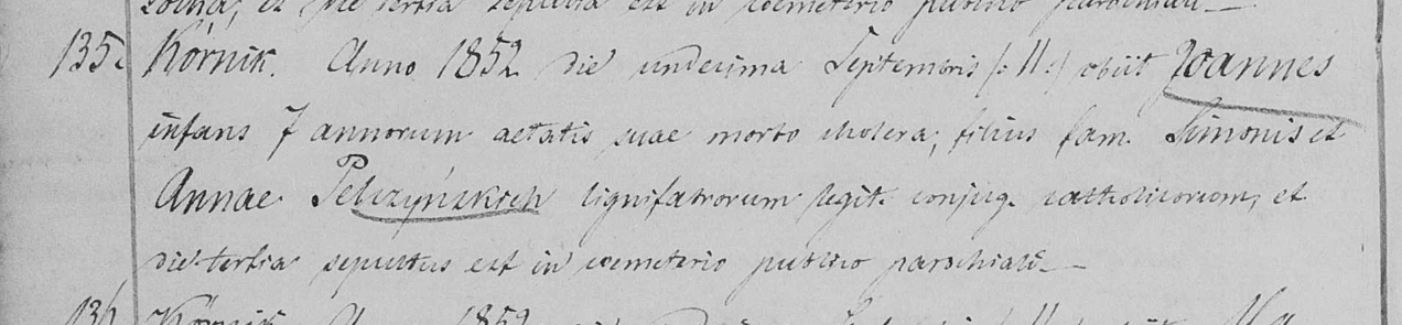 11 IX 1852 zmarł Jan,, dziecię 7-letnie, na cholerę; syn sławetnego Szymona i Anny Pelczyńskich, stolarzostwa, ślubnych małżonków, katolików; pochowany na 3 dzień na publicznym cmentarzu parafialnym.