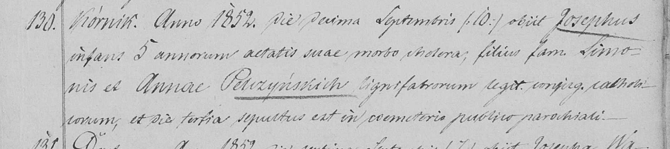 10 IX 1852 zmarł Józef, dziecię 5-letnie, na cholerę; syn sławetnego Szymona i Anny Pelczyńskich, stolarzostwa, ślubnych małżonków, katolików; pochowany na 3 dzień na publicznym cmentarzu parafialnym.