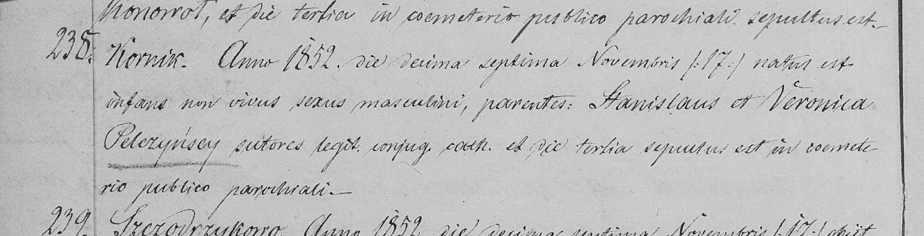 17 XI 1852 urodziło się nieżywe dziecię płci męskiej; rodzice: Stanisław i Weronika Pelczyńscy, szewcostwo, ślubni małżonkowie, katolicy; pochowane na 3 dzień na publicznym cmentarzu parafialnym.