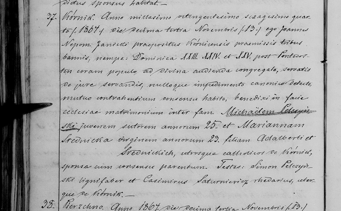 zaślubieni: sławetny Michał Pelczyński, kawaler, szewc, 25 l.; Marianna Średnicka, panna, 23 l., córka Wojciecha i [—] Średnickich; oboje katolicy z Kórnika; narzeczona za zgodą rodziców