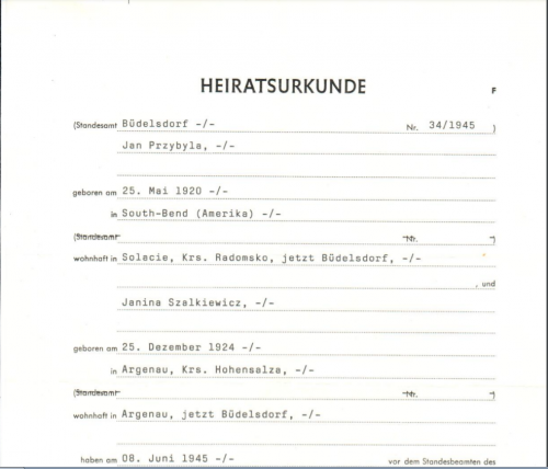 jeden to odpis aktu malzenstwa z 1946 w ktorym miejscowosc urodzenia taka sama