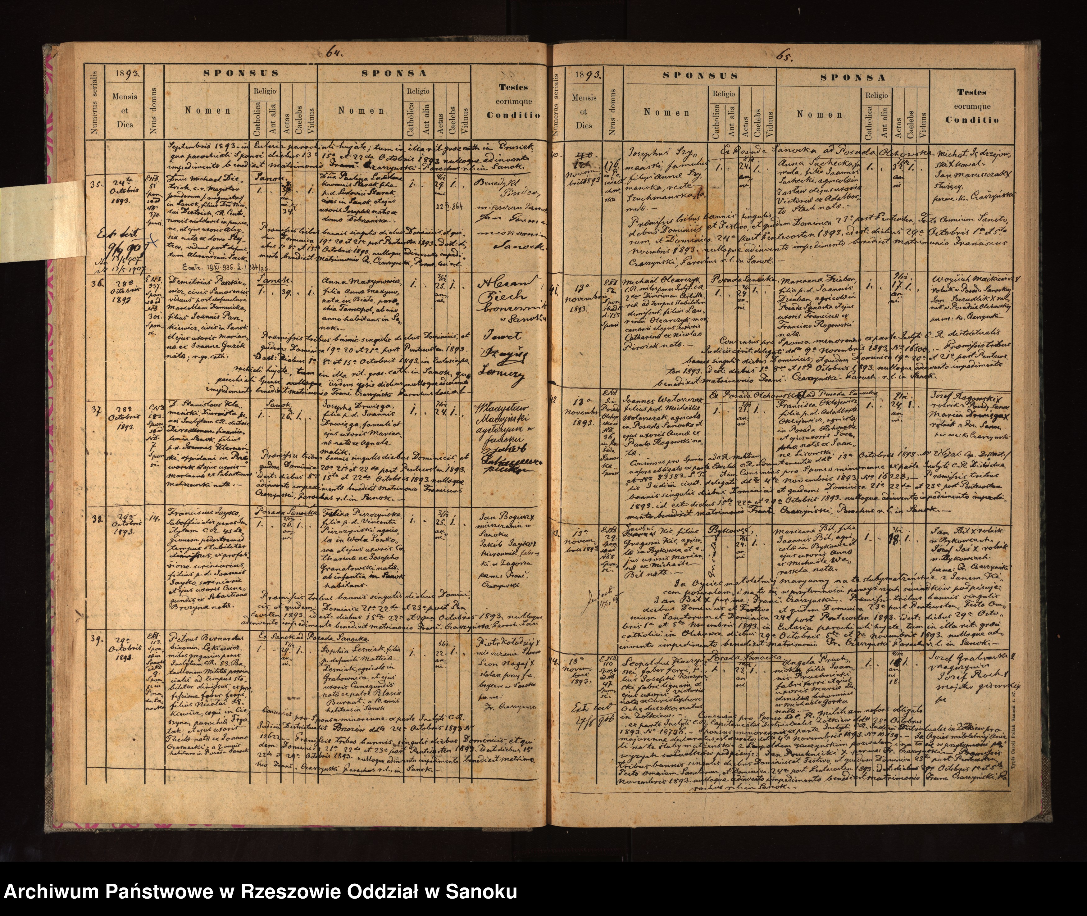 35 / 24 X 1893 / Z ND 51 narzeczonej do ND 370 narzeczonego / pan Michał Dietrich, c.k. wagmistrz w Sanoku, syn pana Mikołaja Dietricha, c.k. kapitana wojskowego na emeryturze, i jego żony Alojzy z domu Stejtzer, wdowiec po zmarłej Aleksandrze Sack; 4/12 34 l., wdowiec / pani Paulina Władysława (2 imion) Starak, córka śp. Ludwika Staraka, obywatela w Sanoku, i jego żony Józefy z domu Dobrzańskiej; 4/12 29 l. (22 XI 864) / Benedykt Pindor, mieszczan Sanok; Jan Germak, mieszczanin sanocki