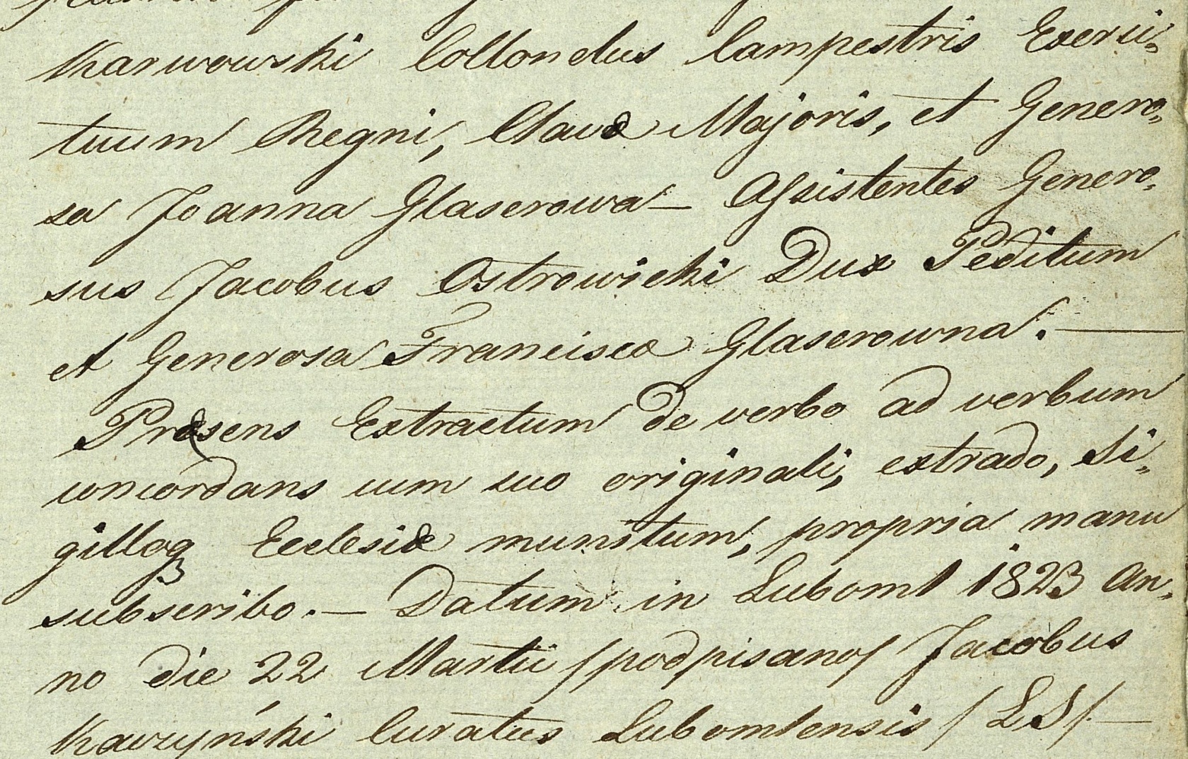 "Karwowski Collon dus lampestris Exercituum Regi olava Majoris, et Generosa Joanna Glaserowa Apistentes Generosus Jacobus Ostrowicki Dux Peditum et Generosa Francisca Gleserowa. Prosens Extractum de verbo ad verbum uncordans sum suo originali, extrado sigillag Ecclesia munitum, propria manu subseribo".